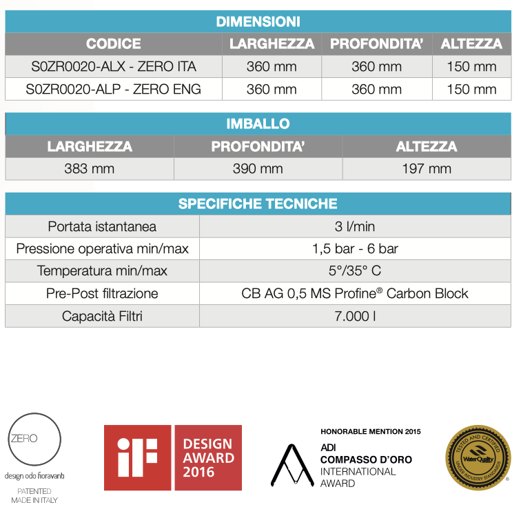ZERO è un sistema ad osmosi brevettato realizzato in una forma compatta, comprensivo di pre-trattamento e post-trattamento ad azione batteriostatica in grado di produrre acqua osmotizzata con alta portata istantanea.